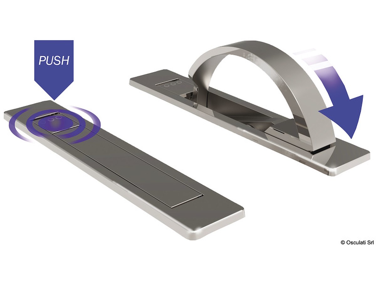 Maniglia con presa larga ed ergonomica dotata di sistema ad estrazione automatica e bloccaggio a scatto. Predisposta per montaggio ad incasso, dotata di chiusura con sistema antivibrazione. Fissaggio con prigionieri M4, senza viti a vista.