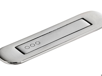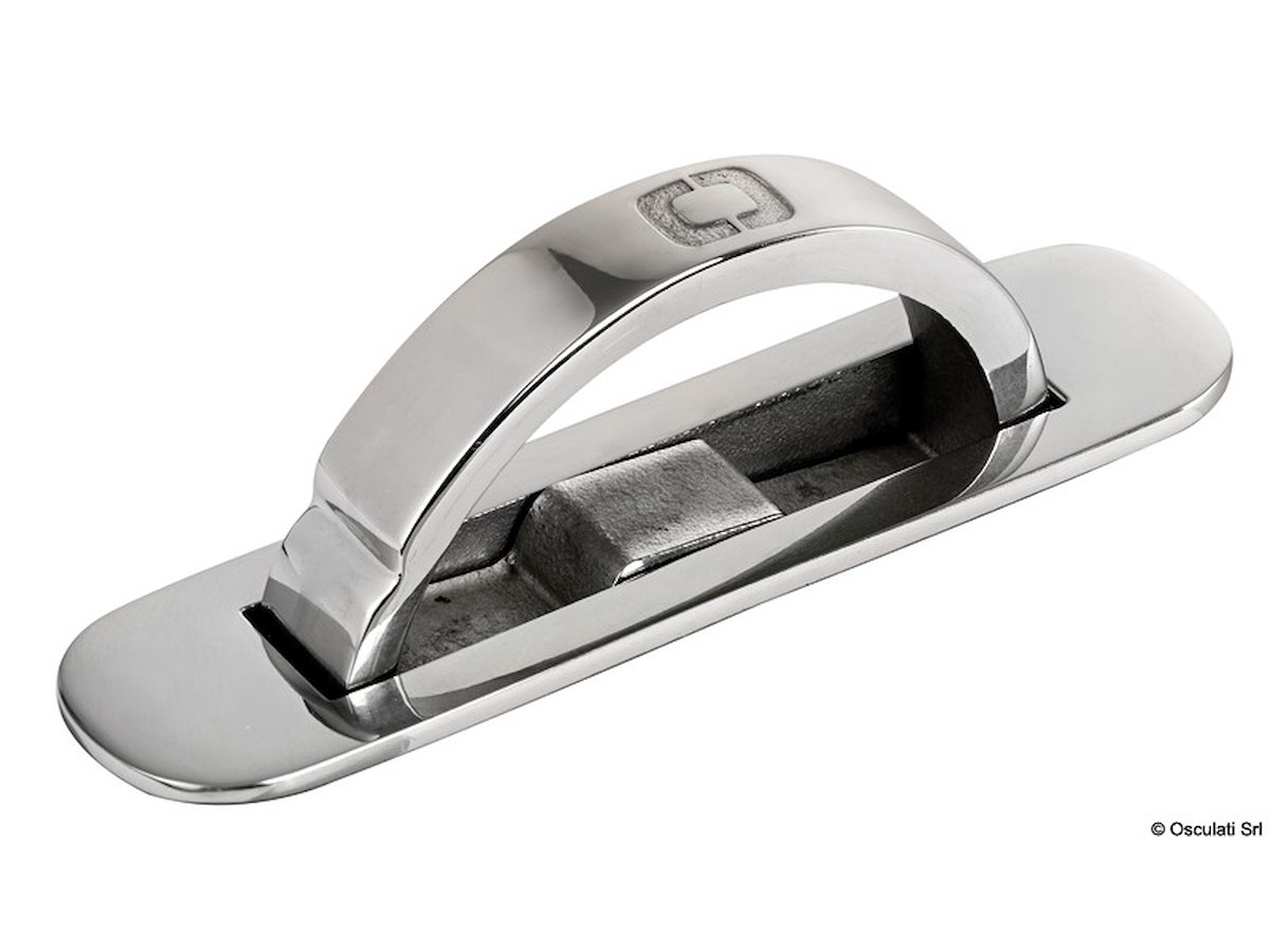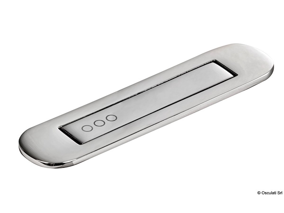 Maniglia di dimensioni compatte in acciaio inox. Il sistema ad apertura rotante permette di avare una presa larga ed ergonomica in poco spazio. Predisposta per montaggio ad incasso, dotata di chiusura con sistema antivibrazione.