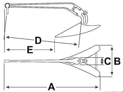 Variante: Forgiata peso : 9 Catena raccomandata mm: 8 Consigliata per scafi fino a m: 9 A mm: 690 B mm: 279 C mm: 86 D mm: 484 E mm: 313