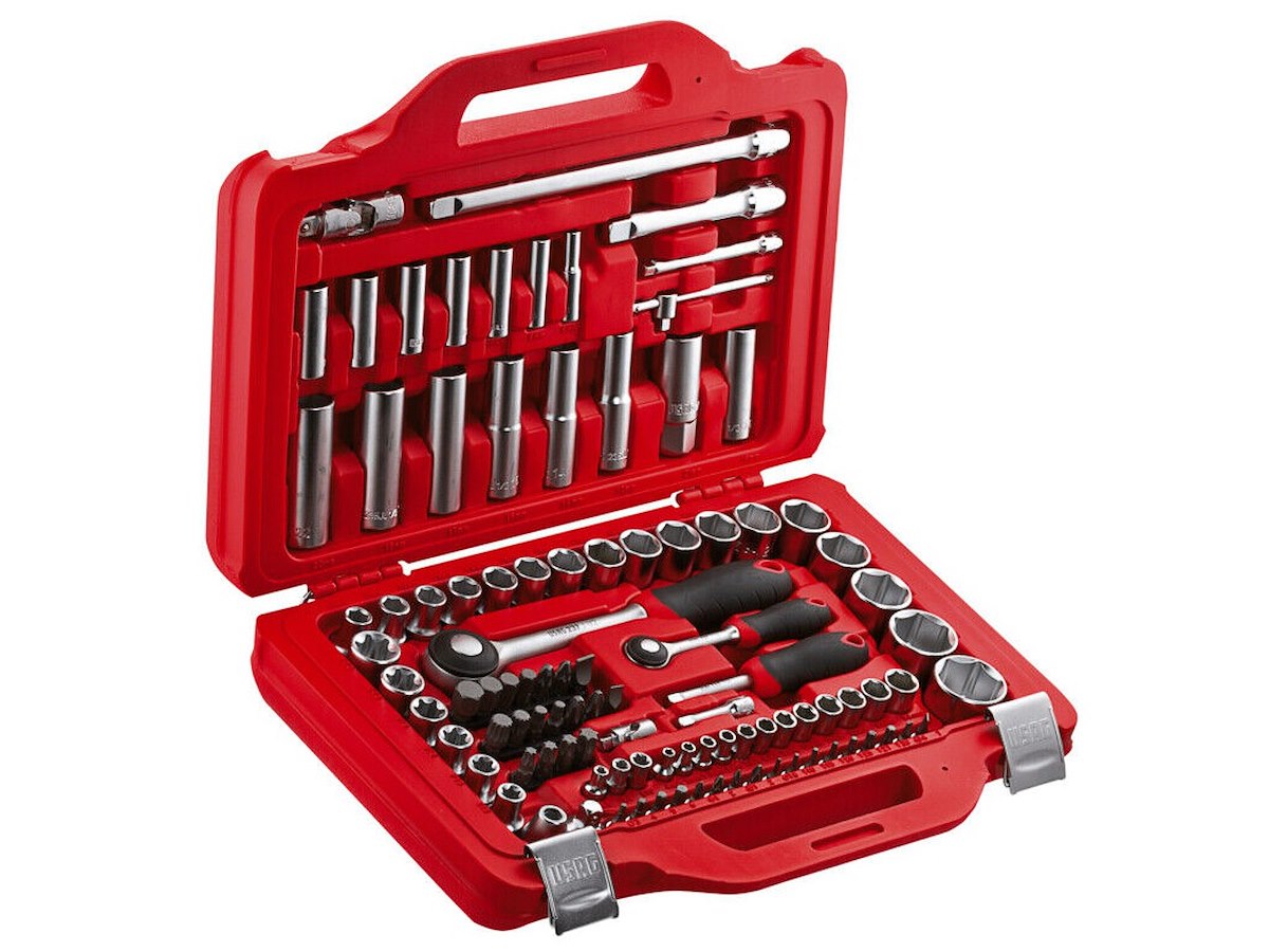 Assortimento in cassetta modulare con bussole esagonali e chiavi combinate (82 pz) Inclusi cricchetti reversibili 1/4-1/2'' con meccanismo a 72 denti e sistema di sgancio della bussola