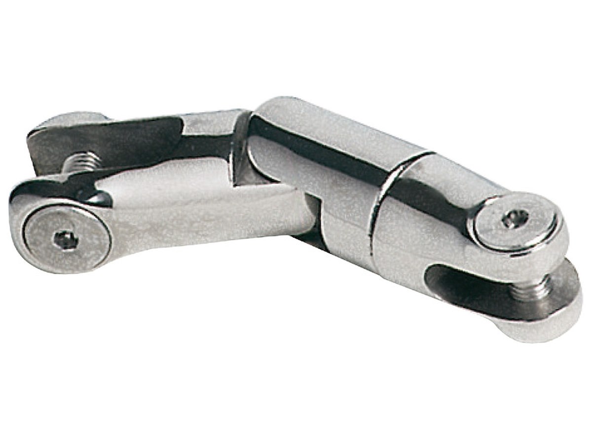 In acciaio inox AISI 316, senza sporgenze. Questo attacco girevole a doppio snodo è l'evoluzione del modello 01.740.08/10, che è a snodo semplice.