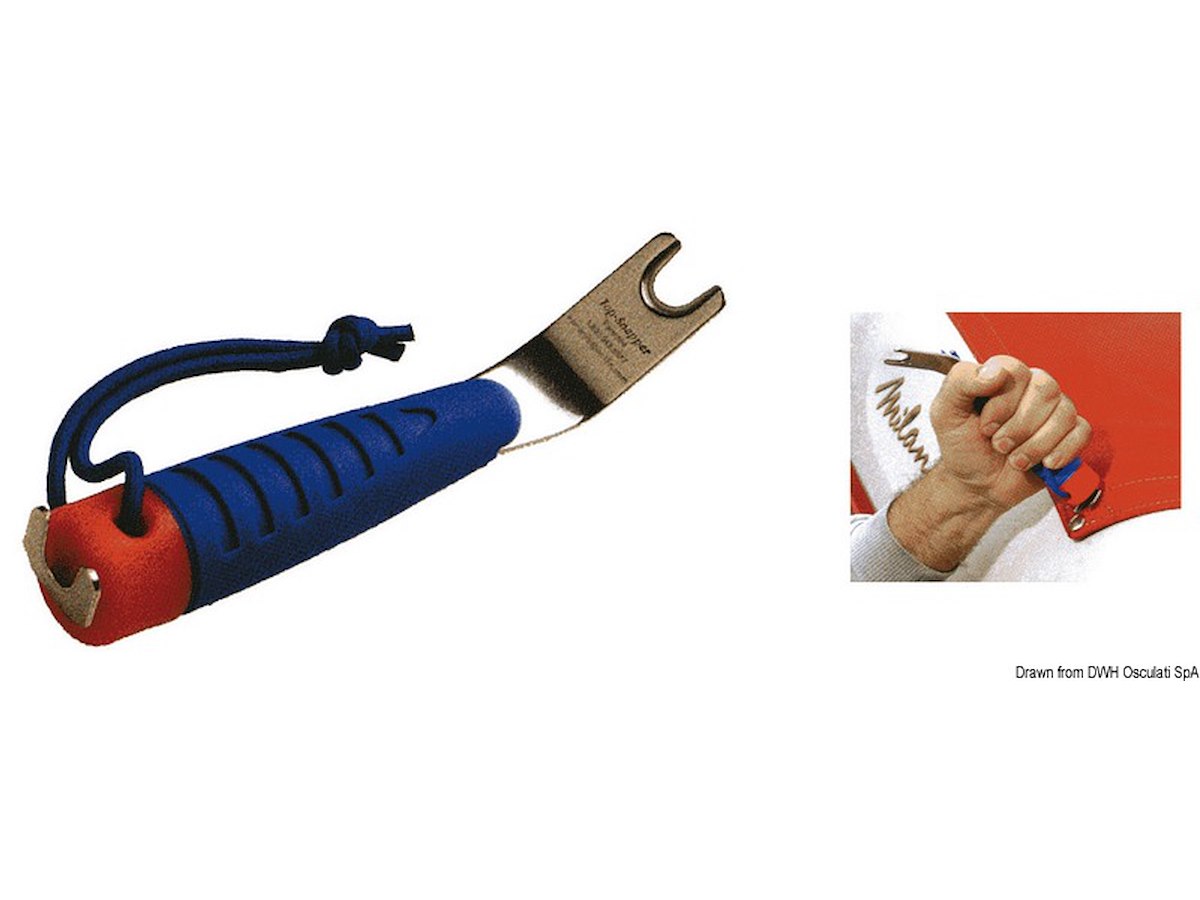 Utile per aprire i bottoni automatici senza correre il rischio di strapparli dal tessuto. Materiale: Acciaio inox e nylon