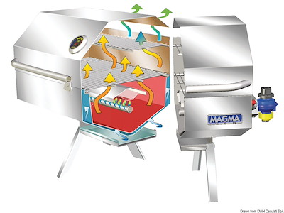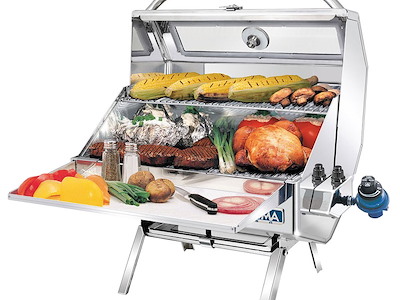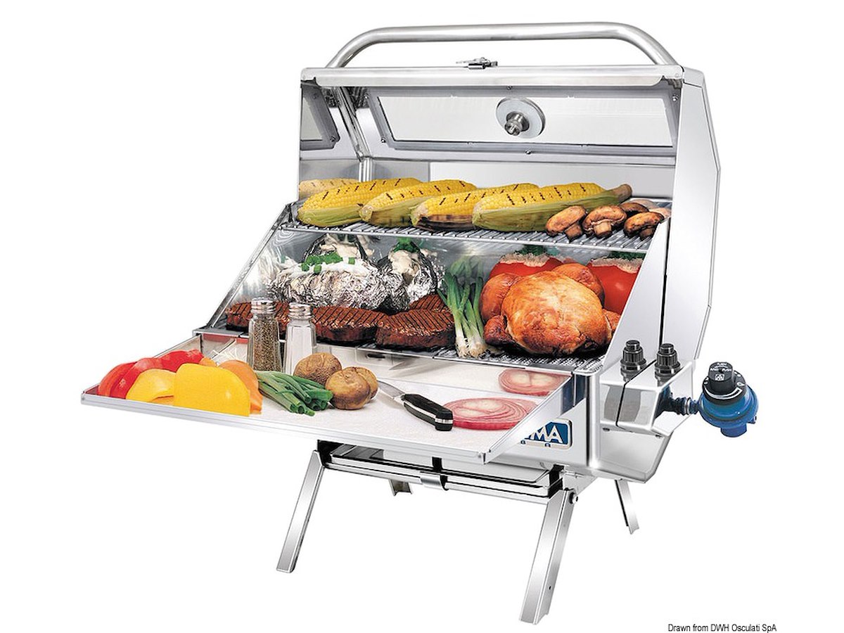 Modello in acciaio inox lucidato. Alimentazione a gas con bombole Camping Gaz. Completi di supporti pieghevoli che permettono di usarlo a terra in area PIC-NIC. Gli schermi incorporati nel sistema di grigliatura sono anti-fiamma, anti-esplosione e rendono uniforme su tutta la superficie il calore di cottura. Accensione elettronica. Completo di regolatore di pressione per bombole Camping Gaz di alluminio (CV270/470).