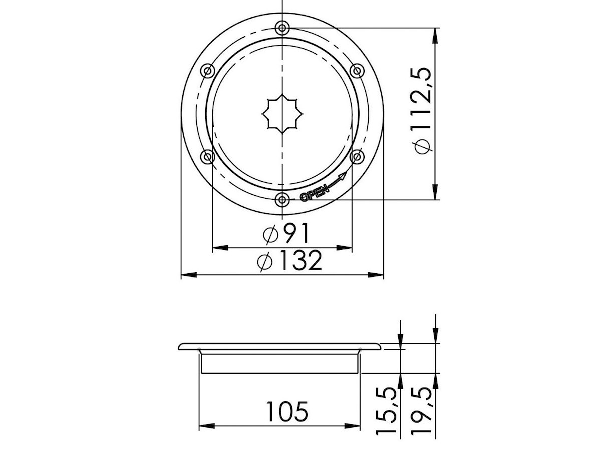 In acciaio inox AISI 316. Apertura a ¼ di giro tramite maniglia winch, non compresa. Il tappo rimane attaccato alla maniglia per facilitare il sollevamento.