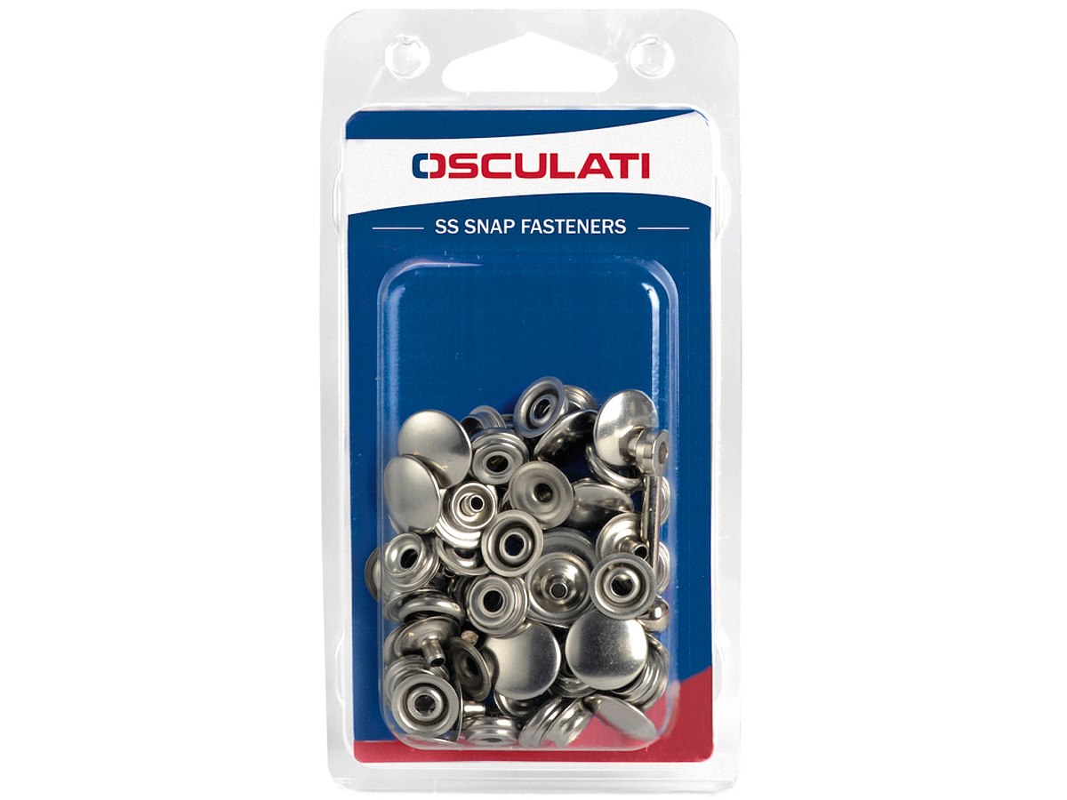 Descrizione: Serie di 15 bottoni testa Ø 17 mm maschio più femmina 10.303.11/12/13, da applicare a capot, tende, ecc. Completa di attrezzo per l’installazione.