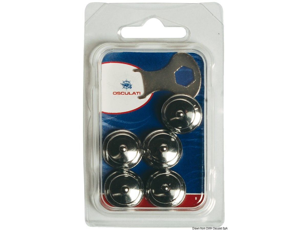 Descrizione: Femmina per capottina versione testa maggiorata, Ø 15 mm per una migliore presa, per tessuti fino a 3 mm Materiale: Acciaio inox pcs : 5 (blister)