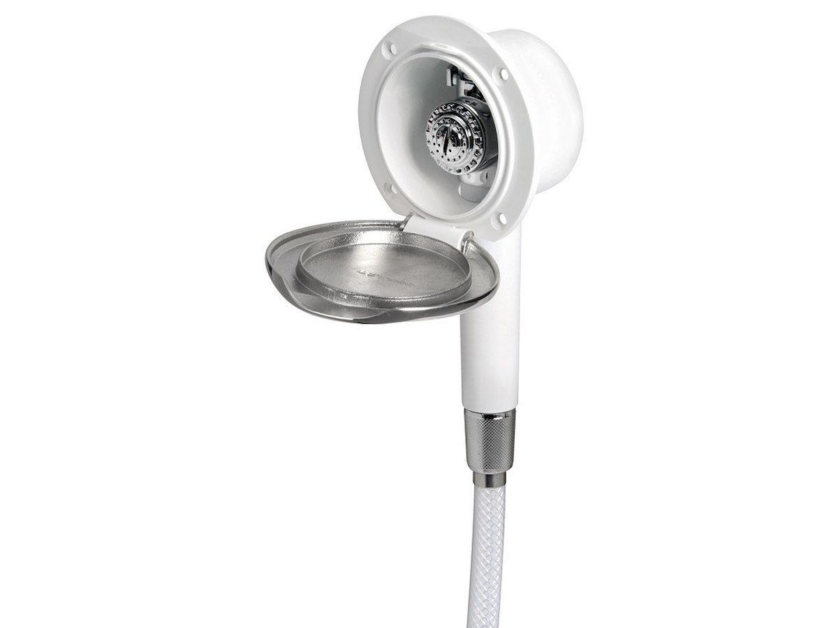 Doccia in ottone cromato, vano di alloggiamento bianco in ASA UV resistente.