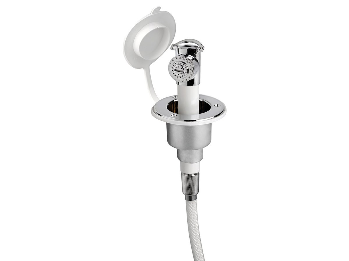In ottone cromato con supporto ad incasso in ASA UV resistente, completo di cappuccio in PVC bianco a tenuta stagna. Sporgenza interna 45 mm.