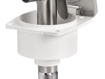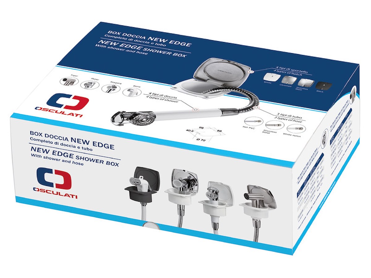Doccia in acciaio inox, vano di alloggiamento bianco in ASA UV resistente.