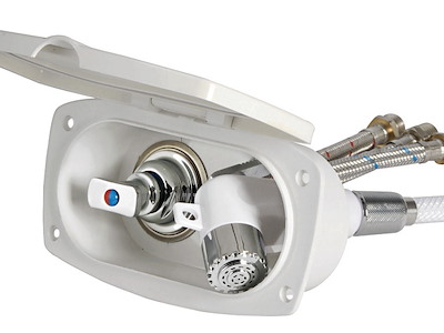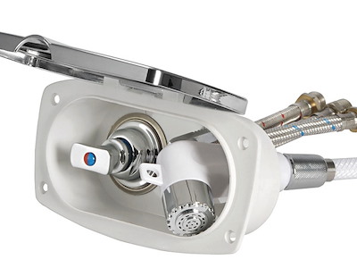 Doccia in plastica con testa cromata, vano di alloggiamento bianco in ASA UV resistente. Completa di rubinetto miscelatore acqua calda/ fredda. Montaggio in piano o a parete.