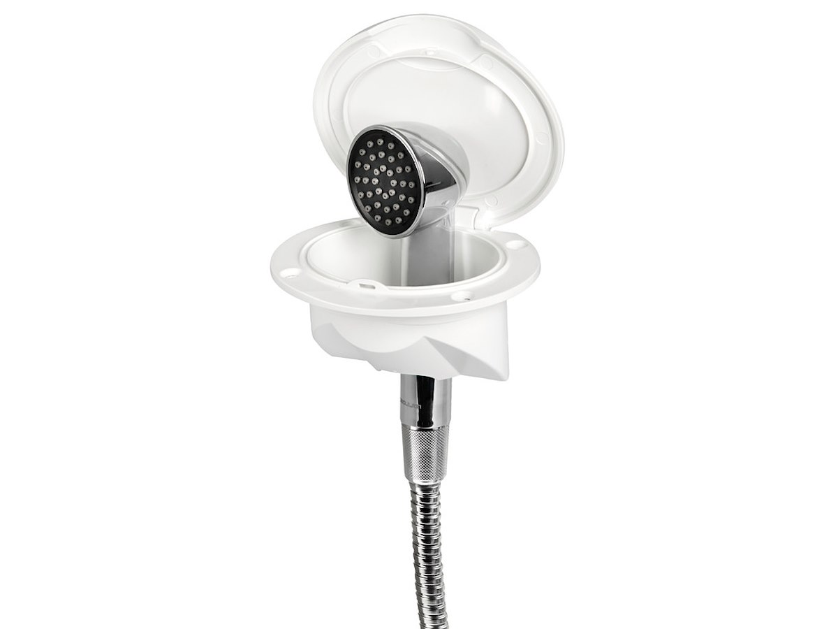 Vano con inserto in acciaio inox AISI 316. Inclinato a 45° per montaggio su piano orizzontale o verticale. Dotato di doccia Keji con testa maggiorata e spruzzatori anticalcare.