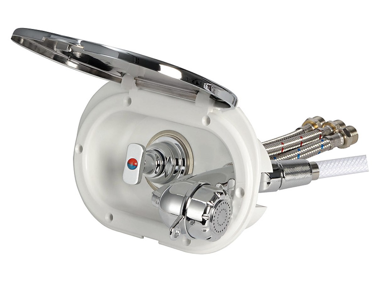 Doccia in plastica cromata, vano di alloggiamento bianco in ASA UV resistente. Completo di rubinetto miscelatore acqua calda/fredda. Montaggio in piano o a parete.