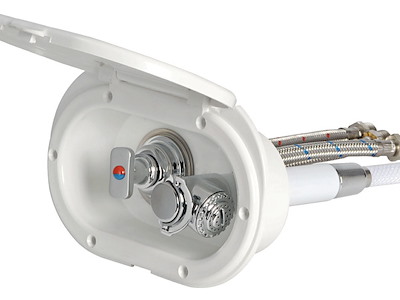 Doccia in ottone cromato, vano di alloggiamento bianco in ASA UV resistente. Completo di rubinetto miscelatore acqua calda/fredda. Montaggio in piano o a parete.