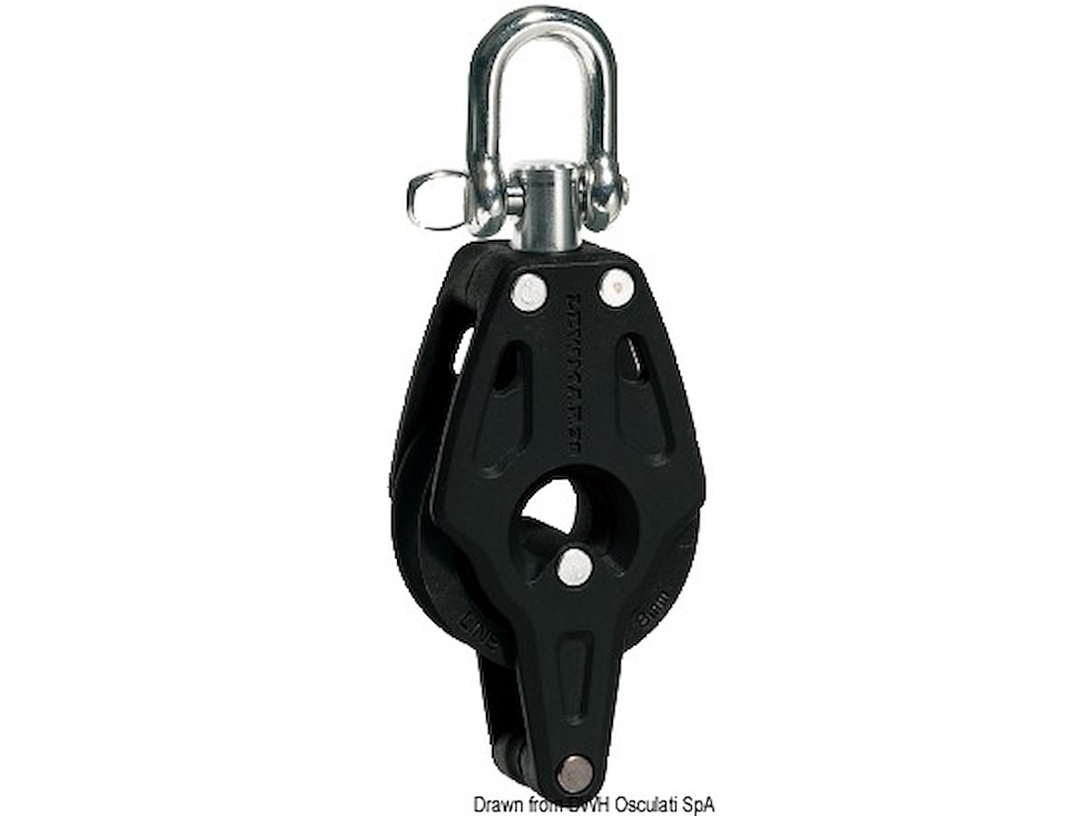 Tipo: Singolo con arricavo Ø puleggia mm: 40 Carico max di lavoro kg: 240 Carico di rottura kg: 800 Per cime mm: 10