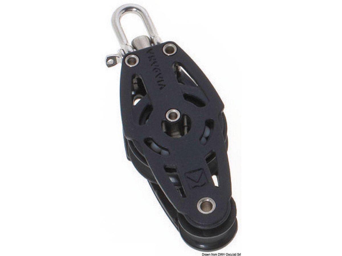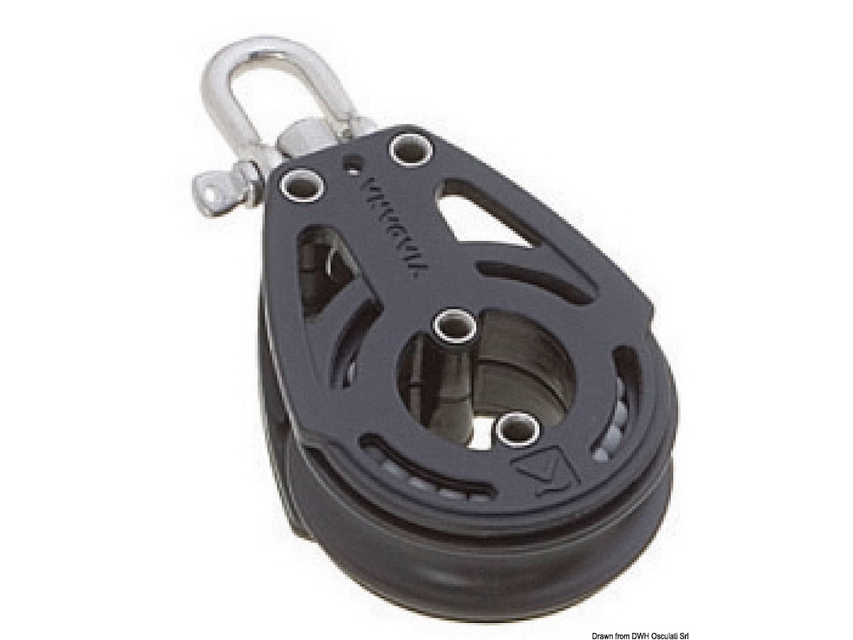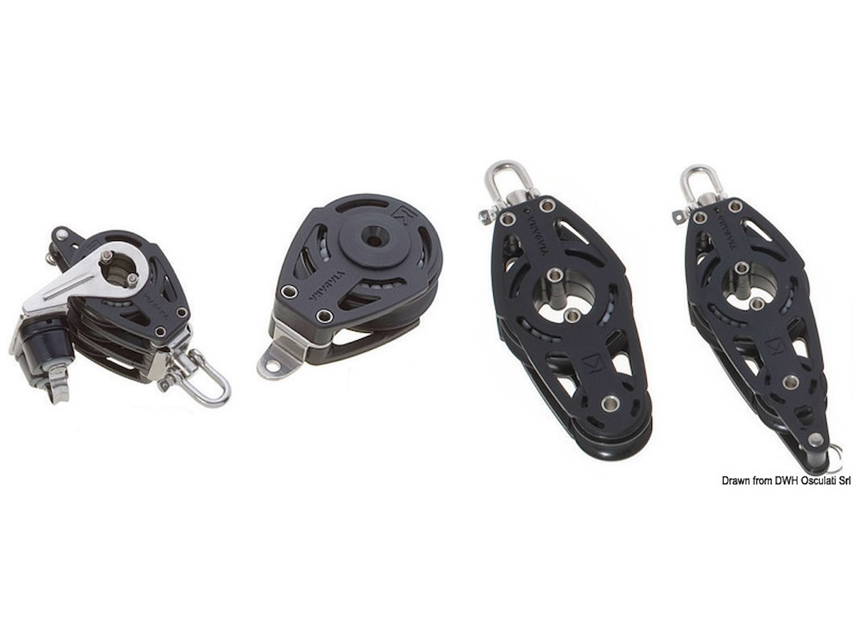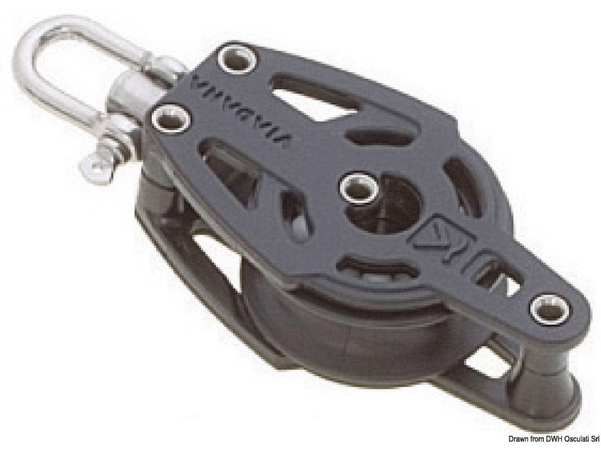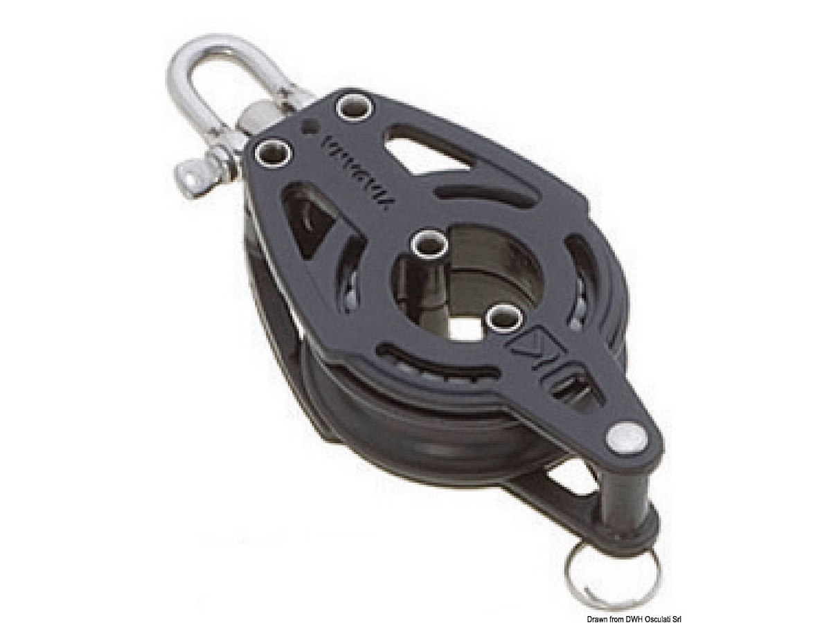 Modello: 2 Pulegge a violino con arricavo Adatto per cime da mm: 10 Puleggia Ø mm: 38 Carico di rottura kg: 600 Carico di lavoro kg: 230