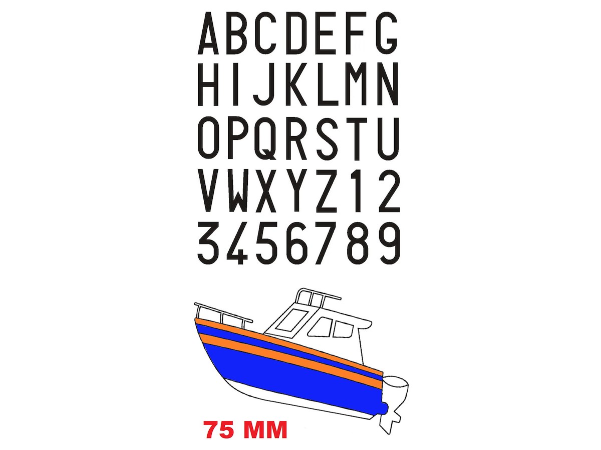 caratteri adesivi fustellati plasticolor, colore NERO provviste di sistema per un facile allineamento, collante per ambiente marino (H 75mm)