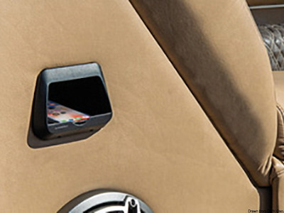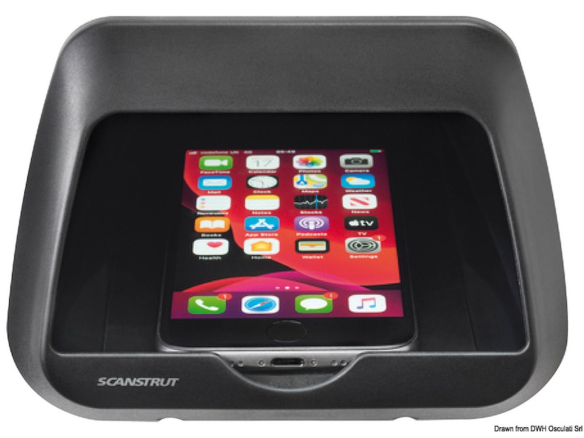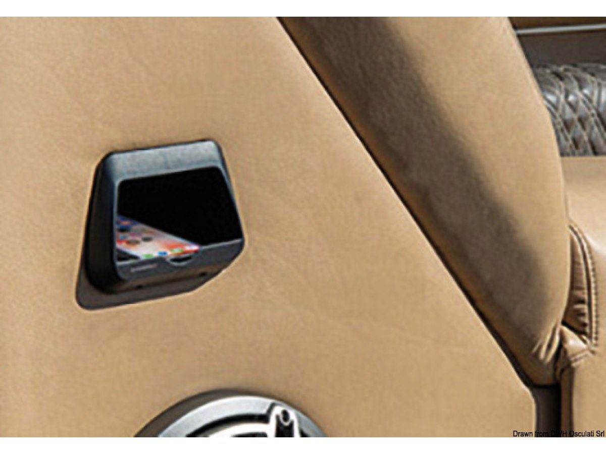 Tecnologia di carica wireless Qi (Apple, Samsung, Huawei, etc). Stagno IPX6. Provvisto di sistema di scarico dell'acqua nel caso questa entri nel vano, che può anche essere usato come porta oggetti.