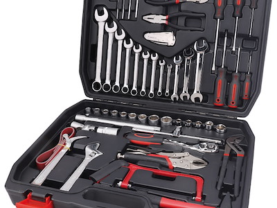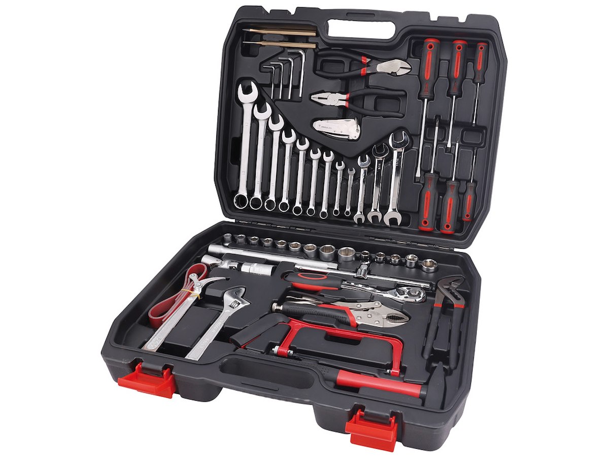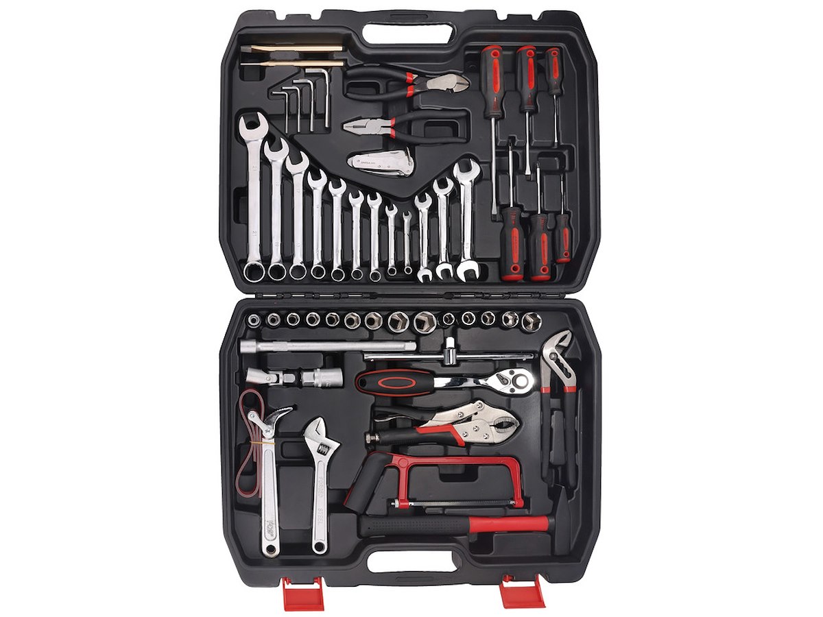 1 cacciaspina Ø 4 mm; 1 scalpello piatto 150 mm; 9 chiavi combinate 7-8-10-11-13-14-17-19-21 mm; 3 chiavi a forchetta doppia 3/8x7/16 - 1/2x9/16 -5/8x11/16”; 4 chiavi maschio esagonale piegate Ø 3-4-5-6 mm; 1 chiave regolabile a rullino con scala graduata 200 mm; 9 chiavi a bussola bocca poligonale Ø 10-11-12-13-14-17-19-22-24 mm; 5 chiavi a bussola bocca poligonale Ø 7/16 - 1/2- 9/16 - 11/16 - 7/8“; 1 prolunga con attacchi quadri maschio e femmina 1/2”, 250 mm; 1 snodo con attacchi quadri maschio e femmina 1/2”; 1 quadro maschio 1/2” con spina scorrevole; 1 cricchetto reversibile con attacco quadrato maschio 1/2”; 1 chiave a bussola con attacco quadro femmina 1/2” per candele d’accensione; 1 pinza regolabile, cerniera sovrapposta, manici ricoperti in PVC, 235 mm; 1 pinza regolabile autobloccante, ganasce concave, 220 mm; 1 tronchese a grande effetto a taglienti diagonali, manici ricoperti in PVC; 1 pinza universale manici ricoperti in PVC antiscivolo; 3 giraviti per viti con testa con intaglio 3x75 - 5,5x100 - 6,5x150 mm; 3 giraviti per viti con impronta a croce phillips 0x3x60 - 1x5x80 - 2x6x100 mm; 1 martello tipo tedesco con manico in legno; 1 chiave a nastro per filtri olio Ø max 160 mm; 1 miniseghetto; 1 coltello nautico in acciaio inox.
