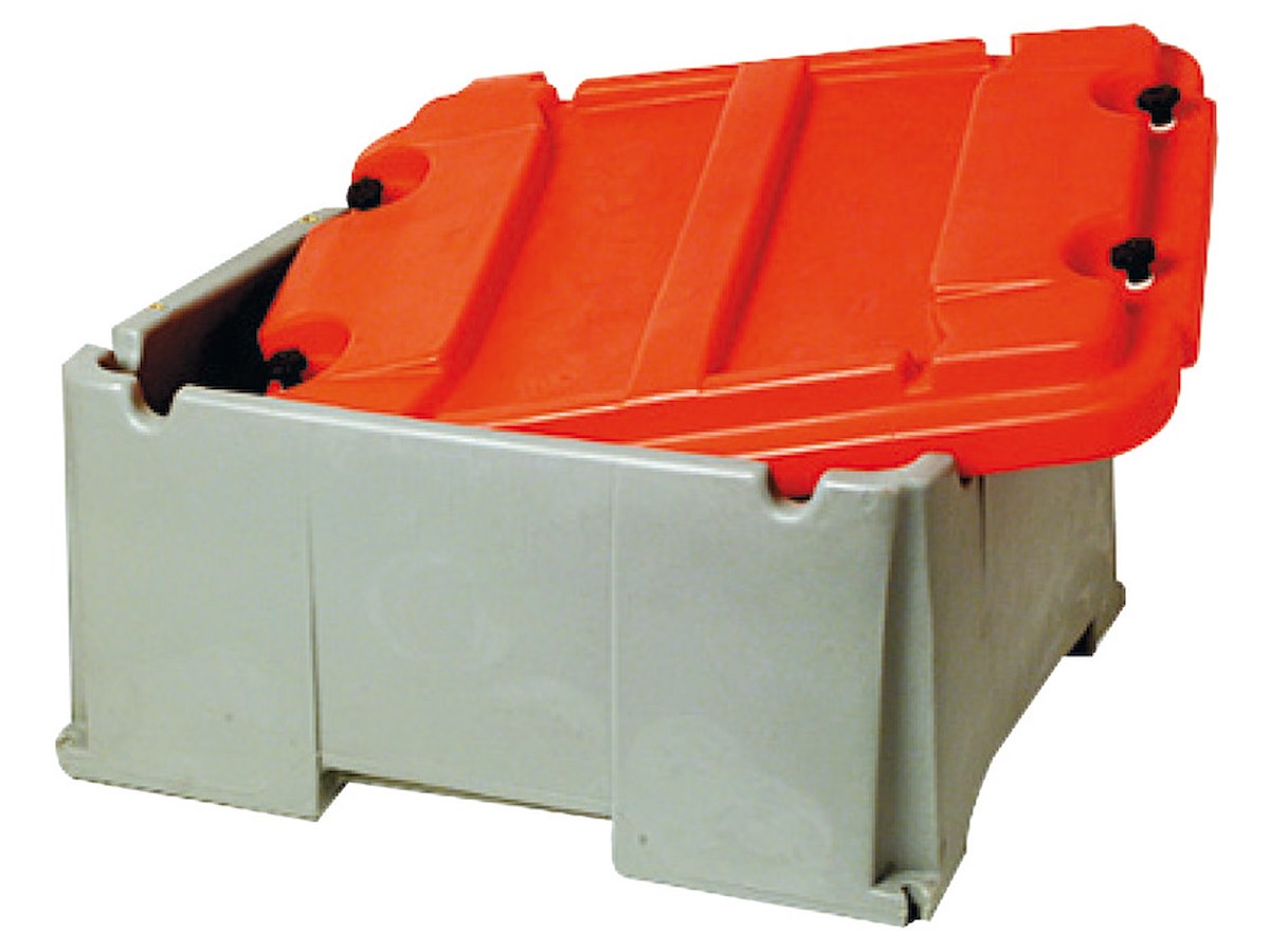 Completa di coperchio, progettata per contenere le batterie di grande capacità, da 120 A·h a 220 A·h (tipo nostre 12.408.01/03/04) a norma DIN di qualsiasi marca.