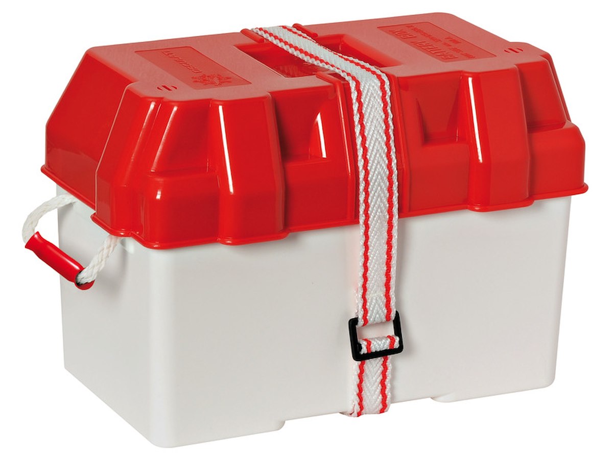 Fabbricata in: Moplen bianco / rosso Per batterie massimo A·h: 100 misure - interne mm: 320x180x190h misure - esterne mm: 380x225x260h Nastro fissa batteria di ricambio: [14.546.03] COLORE_Price_PKG : 10