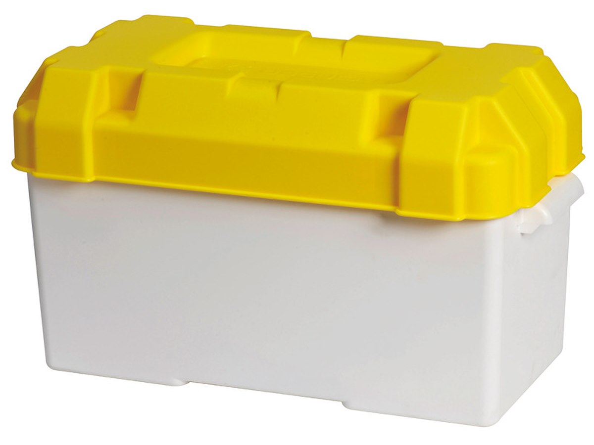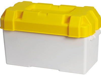 Fabbricata in: Moplen bianco / giallo Per batterie massimo A·h: 120 misure - interne mm: 384x177x205 --> 235 misure - esterne mm: 440x240x260 --> 290 Nastro fissa batteria di ricambio: [14.546.04] COLORE_Price_PKG : 10