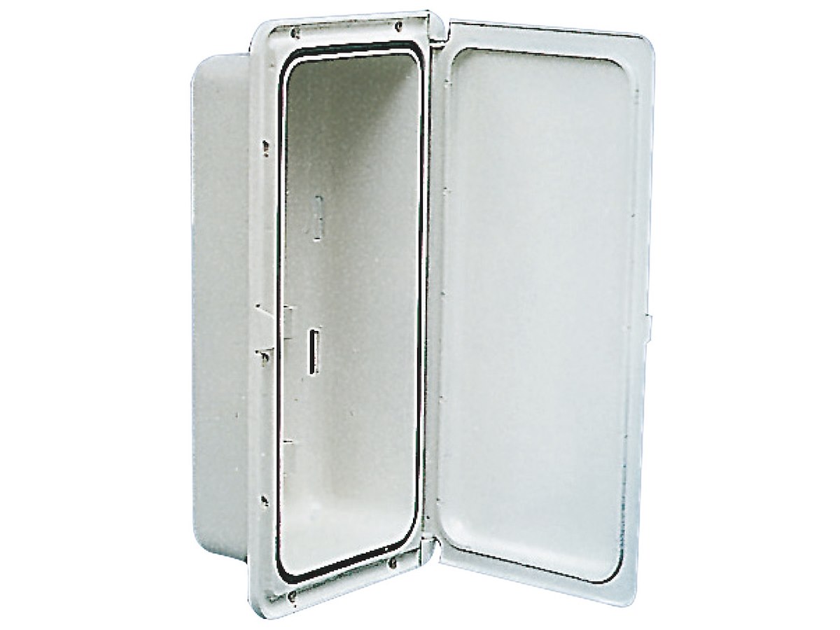 Vano in polipropilene bianco con sportello di chiusura a tenuta stagna con guarnizione in neoprene. Cornice con viti a scomparsa, coperchio in policarbonato bianco resistente UV.