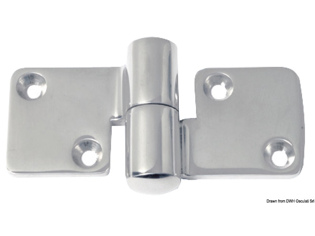 Cerniera in acciaio inox AISI 316 fusa e lucidata a specchio per porte e cofani amovibili, con finitura curata.
