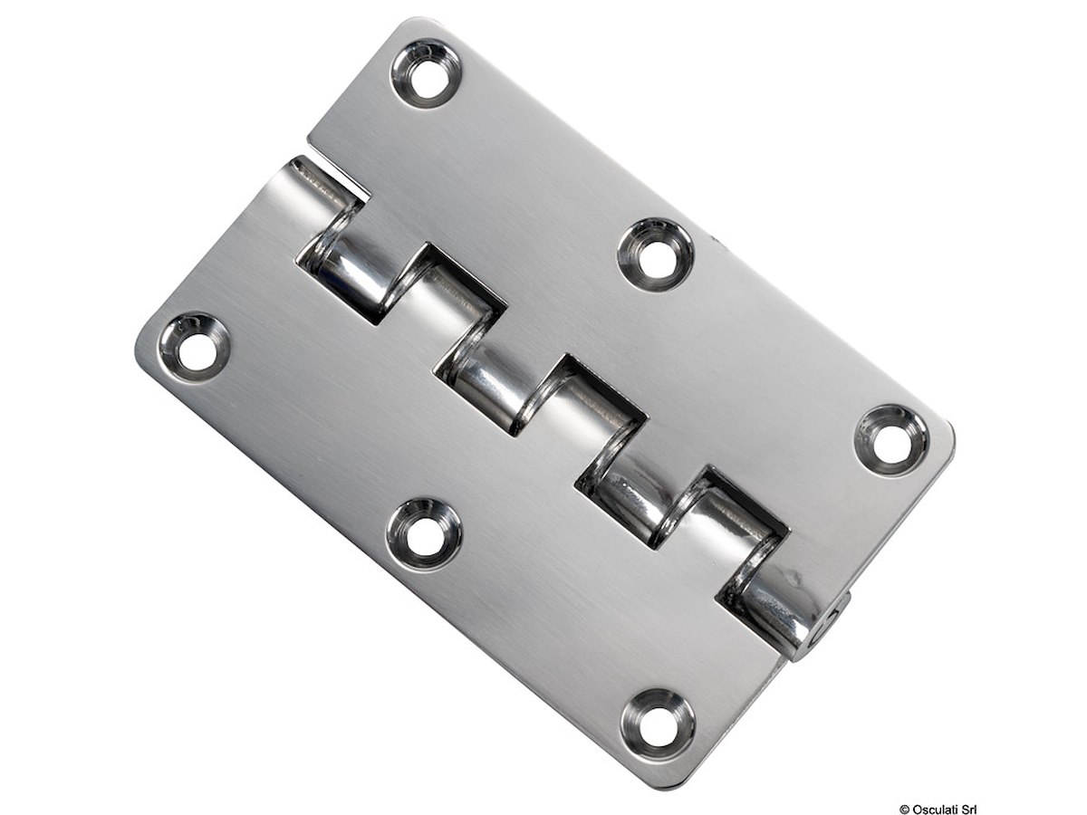 Coppia torcente costante 55 kg/cm ± 15%. Esempio: 2 cerniere possono reggere un portello pesante 3.8 kg e profondo 40 cm. Costruita in acciaio inox AISi 316.