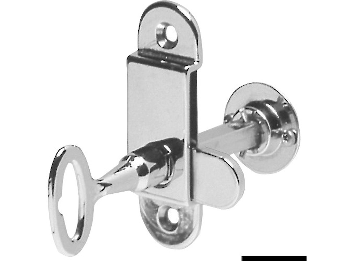 In ottone cromato con quadro a filo e chiave. Adatta per gavoni e portelli. Tavella mm: 80x25 Quadro mm: 7x60 Rosetta Ø mm: 30