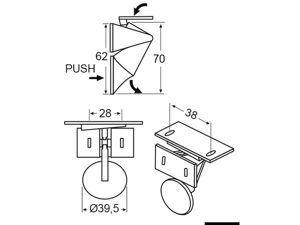 Si monta all’interno dell’antina lasciando un foro che viene chiuso dalla parte lucidata a specchio; per aprire l’antina si esercita una pressione sul foro che funge anche da maniglia. Contropiastra con dente inclinato per maggior facilità di installazione.