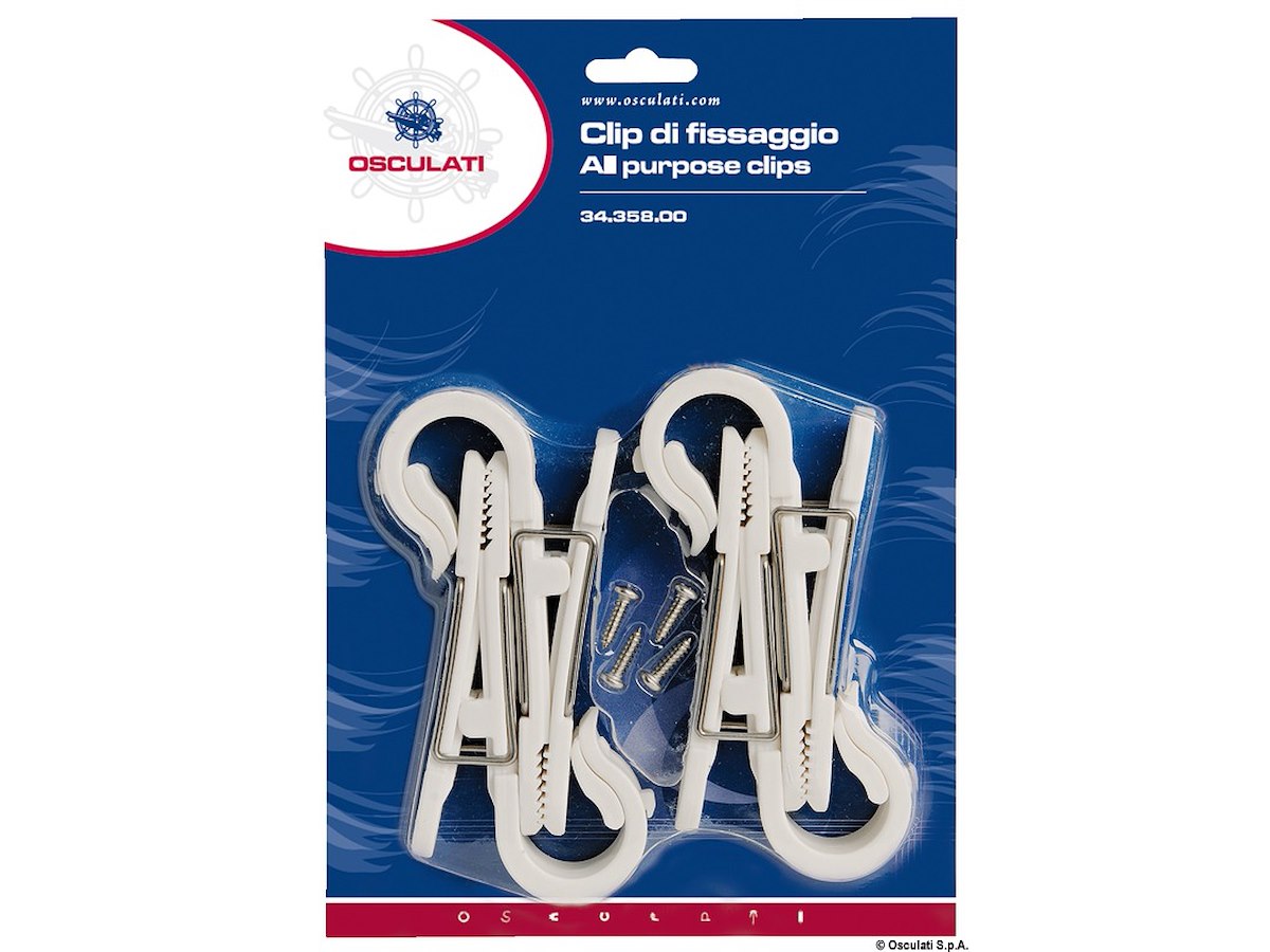 Si può fissare a parete tramite una vite, oppure agganciare al pulpito a scatto (accetta tubi Ø 22/28 mm). Può servire per appendere vestiti ad asciugare, cime, cavi elettrici, ed ogni altro oggetto. Costruita in nylon bianco + molla in acciaio inox.