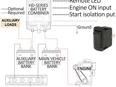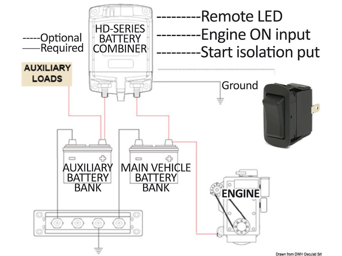 Collega i banchi batterie (avviamento + servizi) quando è in funzione alternatore/caricabatterie e scollega i banchi quando cessa il sistema di ricarica.