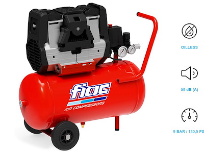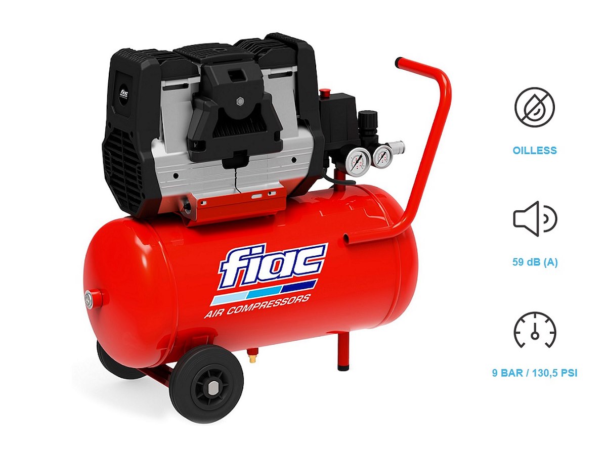 compressore portatile coassiale senza olio(oil free) completo di serbatoio di accumulo, motore 2 cilindri, supersilenziato grazie all'esclusivo gruppo pompante con protezioni in plastica che aumentano la sicurezza e riducono la rumorosità