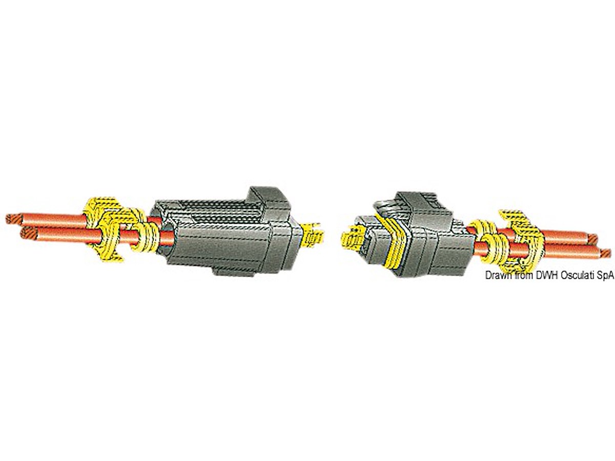 Un connettore completo viene formato da: connettore + 2 faston maschi 14.231.20/40 + 2 faston femmina 14.231.0/30 + 4 tasselli con guarnizione della appropriata sezione 14.232.01/02.