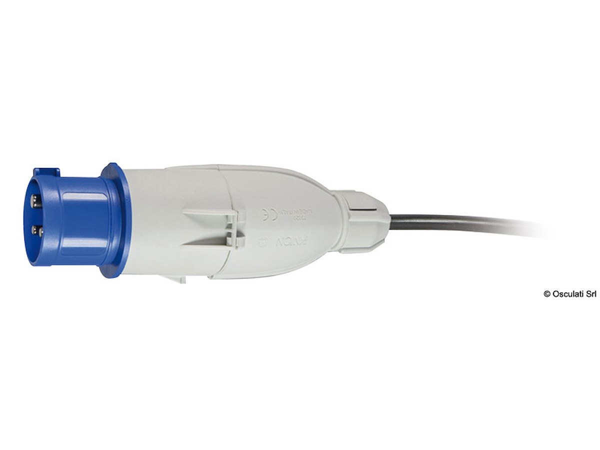 Trasforma le prese da banchina (femmine 16A) a prese civili (Schuko 3 poli piccole o 3 poli grandi). Resistente alla pioggia con un grado di protezione IP44 grazie al sistema di chiusura del cavo posteriore brevettato.