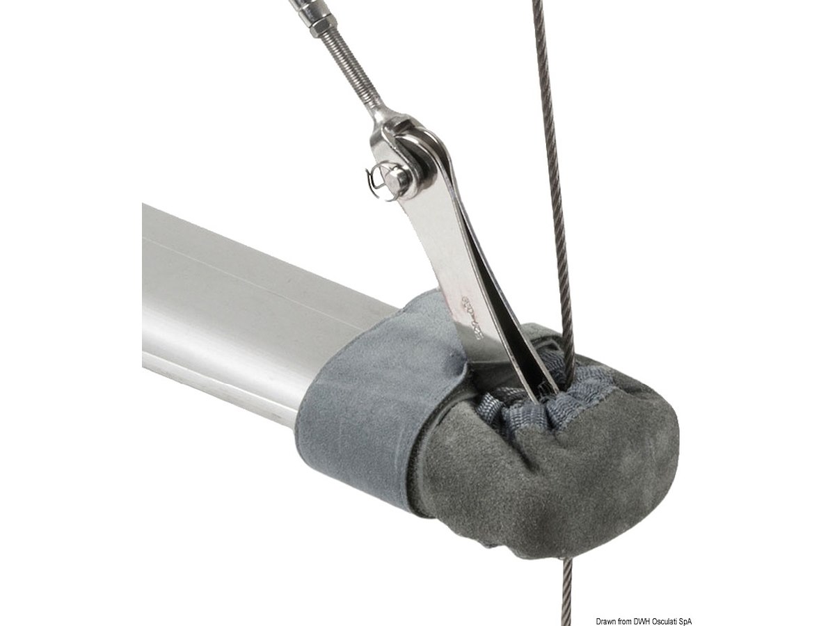 Pelle trattata antiacqua, sale, UV, con bordatura elastica ed anima in neoprene. Fissaggio tramite dispositivo a strappo. Adatti ad ogni tipo di crocetta. Montaggio rapidissimo. Vendute a coppia.