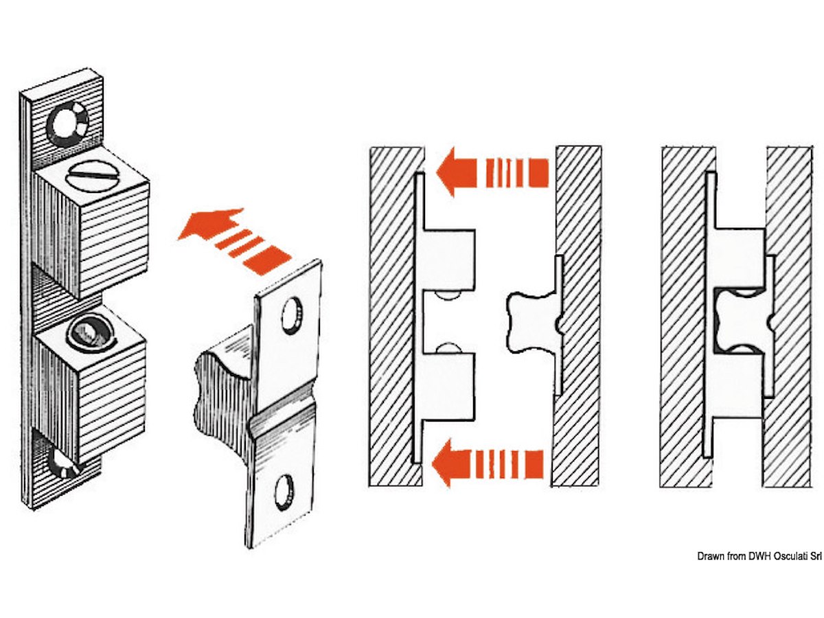 Portelli e antine a scatto con riscontro, con due sfere regolabili a vite. In