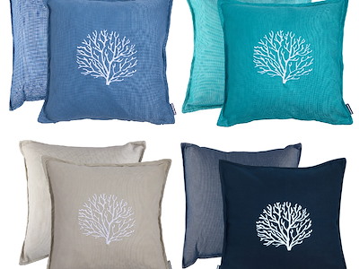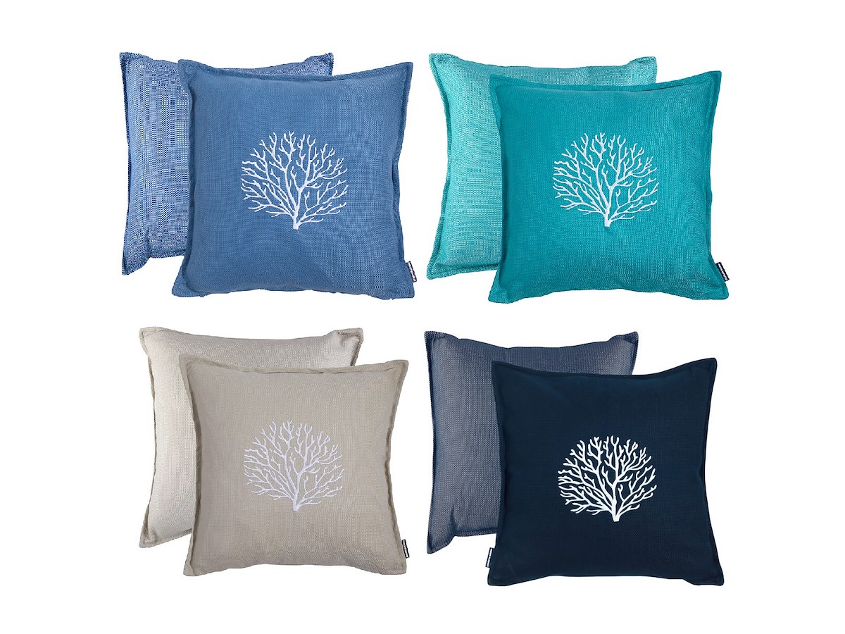 Set di due cuscini waterproof Aruba (45×45 cm) con ricamo di corallo bianco. Realizzati in polipropilene, con tatto morbido e resistenti al sole, macchie e liquidi. Lavabili con candeggina, facili da pulire. Un lato liscio e l’altro screziato. Perfetti per esterni, mantieni i tuoi cuscini come nuovi.