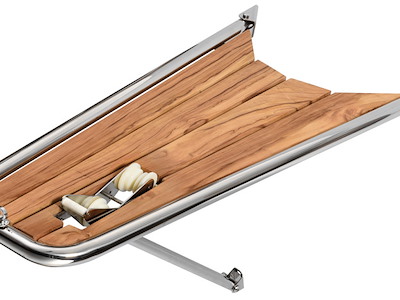 In acciaio inox AISI 316 lucidato a specchio con grigliato in vero teak. Puntone di sostegno regolabile.