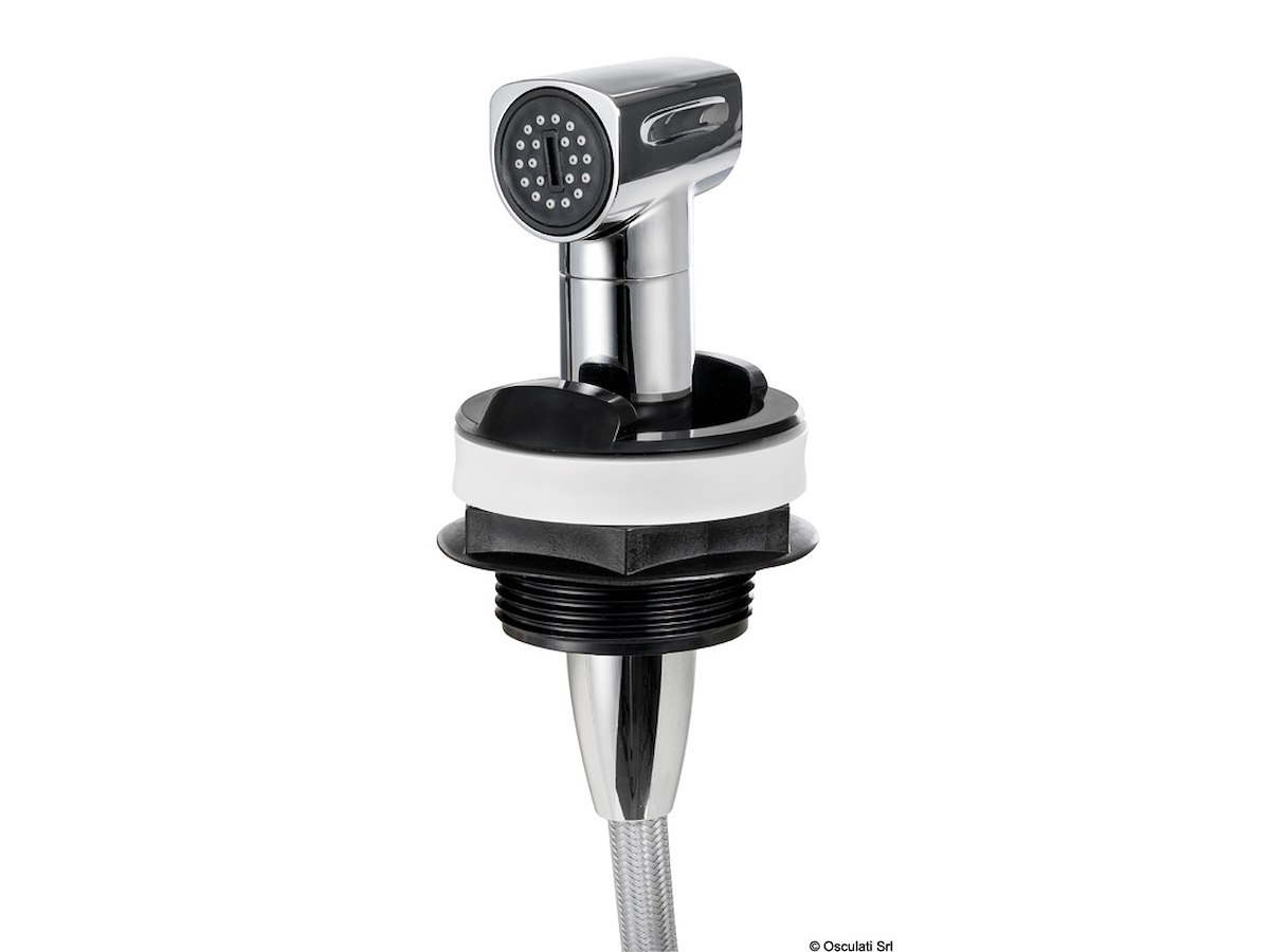 Regolazione dell’acqua calda e fredda gestita tramite la rotazione del corpo della doccetta, mentre il flusso è regolato da un bottone push lock che consente di bloccare il getto d’acqua ed evitare sprechi.