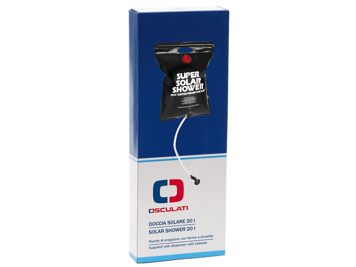 Costruita con un particolare PVC che assorbe i raggi solari, riscaldando l’acqua contenuta nell’interno. Munita di erogatore con fermo a pinzetta.