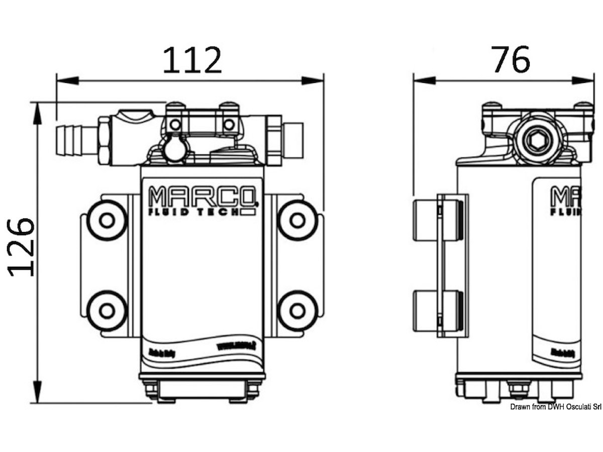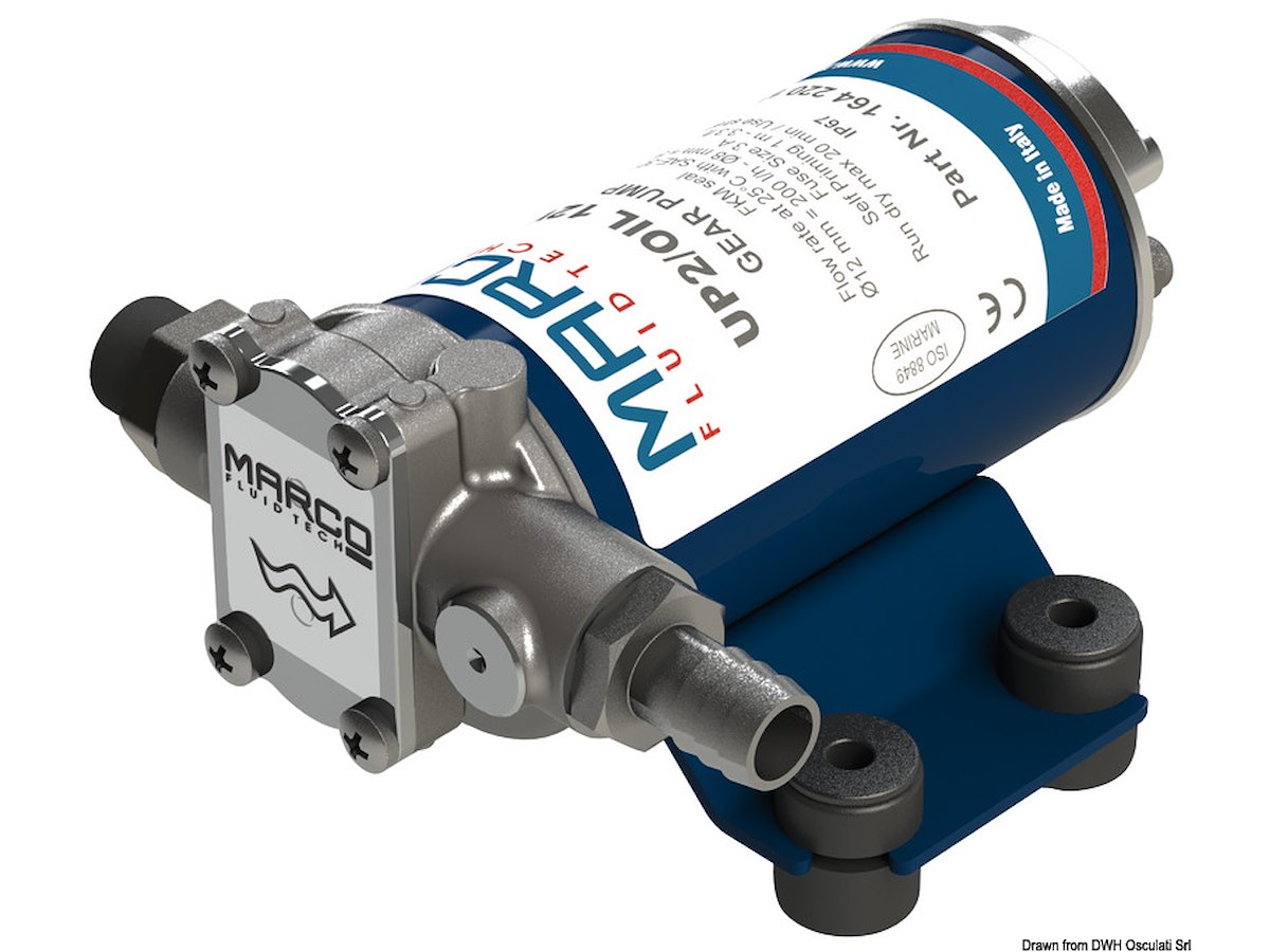 Sigla: UP2/OIL V: 12 Portata l/min in tubi mm - Ø 6: 0,3 Portata l/min in tubi mm - Ø 8: 0,9 Portata l/min in tubi mm - Ø 13: 3,3 Fusibile A: 3 Autoaspirante fino a m: 1 Kit tubi OPTIONAL: [16.190.27]