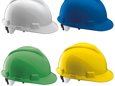 EN 397 CE Elmetto realizzato in polietilene, con bardatura interna di polietilene rigido a quattro sostegni. Dotato di fori per inserimento cuffie, attacco per sottogola, rotella di registro per la regolazione della taglia e fascia tergisudore.