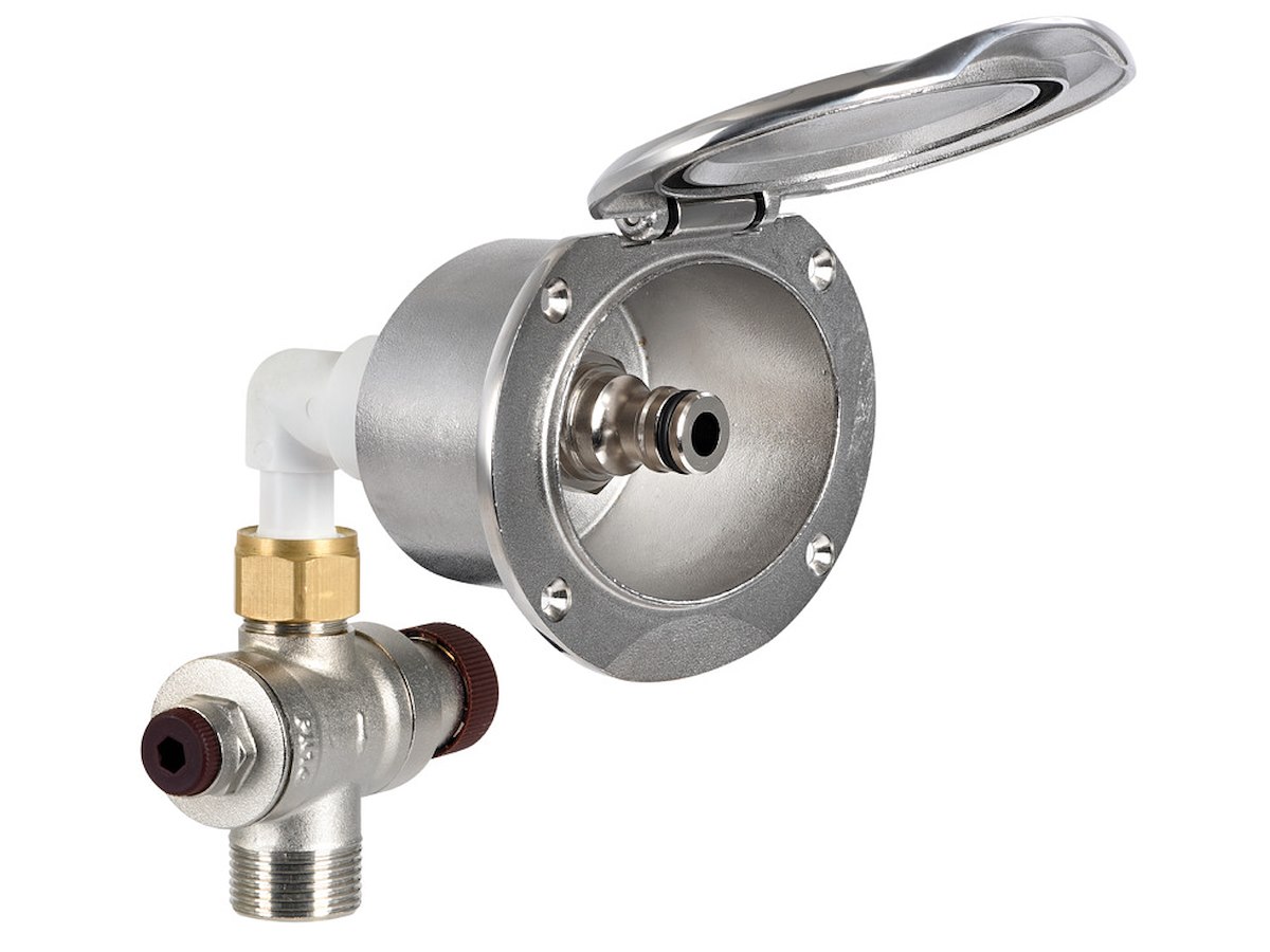 Per l'utilizzo dell'acqua di banchina, questo sistema innovativo riduce stabilmente la pressione a 3 bar, proteggendo le tubazioni da eventuali danni. Il dispositivo, compatto e dotato di regolatore di pressione e valvola di non ritorno in ottone orientabili, garantisce un flusso sicuro e costante. Il tubo per acqua di banchina si collega facilmente grazie al raccordo a scatto tipo giardinaggio (codice 36.189.02). Il filetto di uscita è 3/4" BSP. Anche se l'impianto resta collegato alla banchina, la pressione viene mantenuta stabile a 3 bar, indipendentemente dalla pressione della rete di approvvigionamento