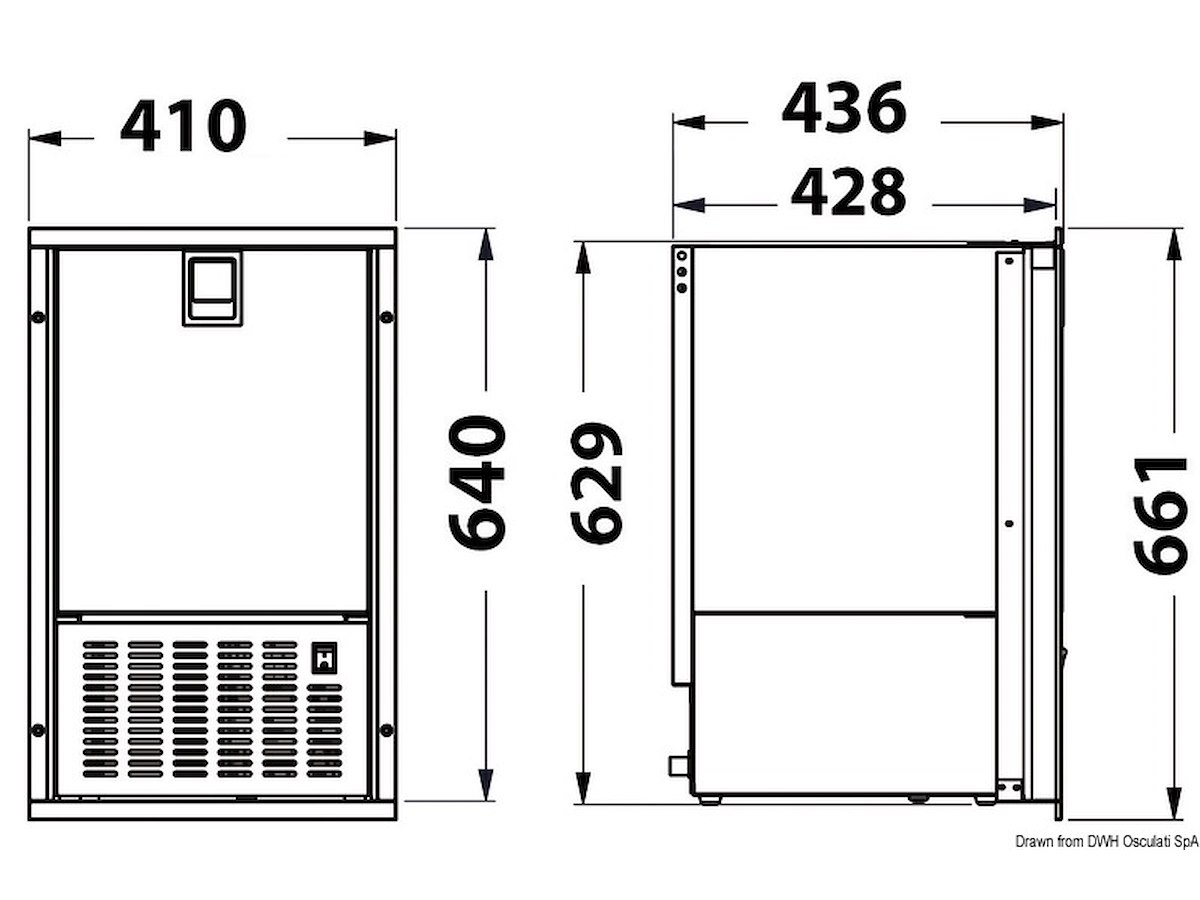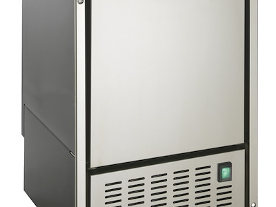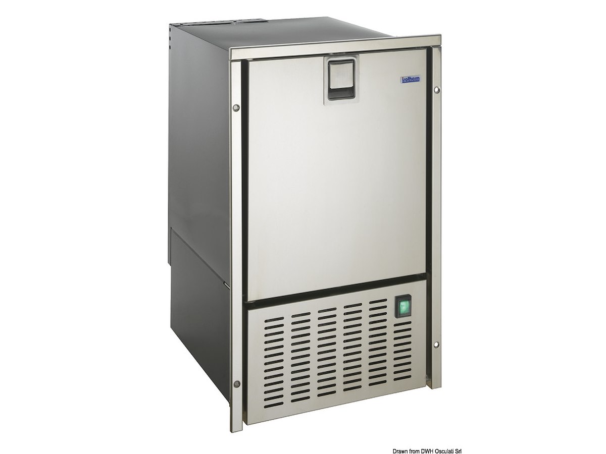 Completamente in acciaio inox, capace di produrre al massimo 8 kg/giorno di ghiaccio bianco. Si distingue per il suo design e per la possibilità di un incasso parziale con cornice su 3 lati o totale, richiedendo a parte la flangia inferiore. Grazie all’esclusivo sistema di ventilazione del gruppo moto condensatore nella parte frontale, è particolarmente indicato per le elevate temperature esterne. Assorbimento 180W e dimensioni che variano a seconda dell’inserimento o meno delle flange. Si consiglia di lasciare 5 cm di spazio posteriormente all’icemaker per lo scarico dell’acqua e per le relative connessioni. Peso 29 kg.