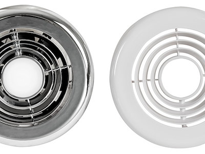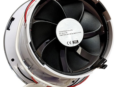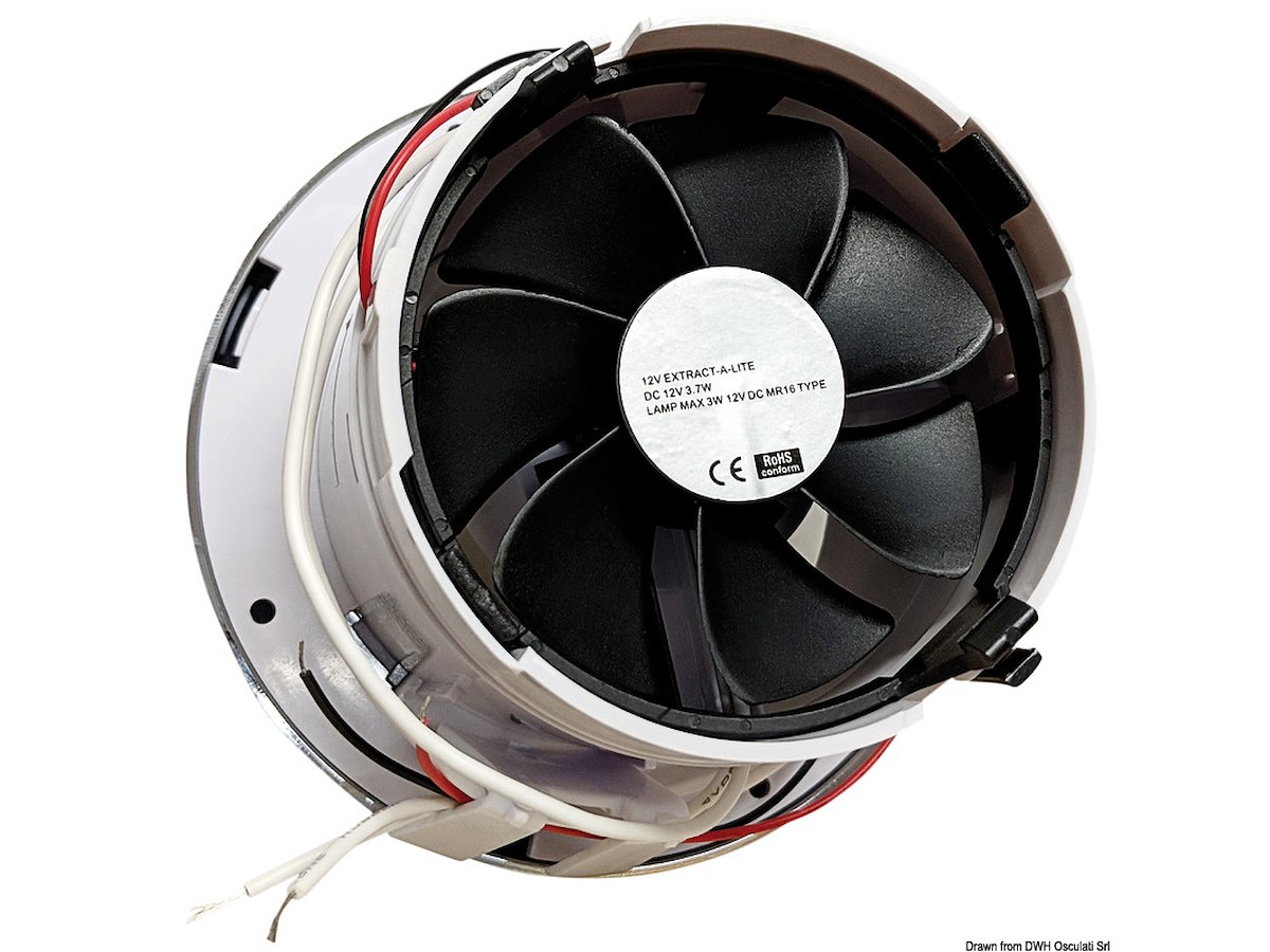 Aspiratore compatto con luce LED incorporata, ideale per bagni e cucine.