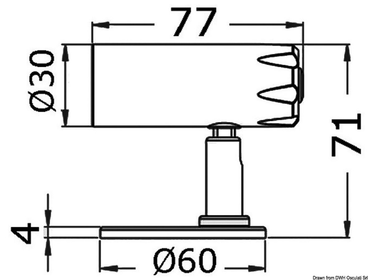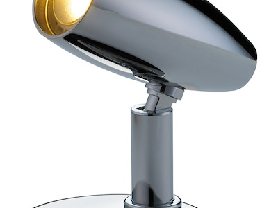 Corpo in acciaio inox lucidato a specchio, testa in alluminio cromato. Interruttore sul retro della testa.