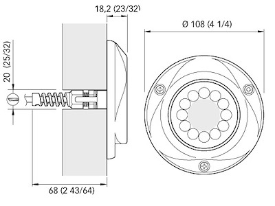 luce a led (luce fredda) per installazioni subacquee IP68, cornice sagomata in acciaio inox AISI316 finitura cromata, ghiera Ø 108mm ingombro 18,2mm, montaggio in superficie con viti a vista, driver integrato, alimentazione 12-24V, foro passante Ø20mm profondità 68mm