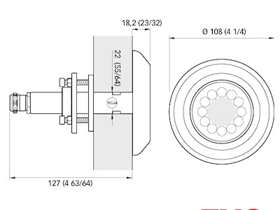 luce a led (luce fredda) per installazioni subacquee, IP68, acciaio inox AISI 316 finitura cromata, ghiera Ø 108mm, ingombro esterno 18,2mm, montaggio con passascafo foro 22mm profondità 127mm, driver integrato, alimentazione 12-24V