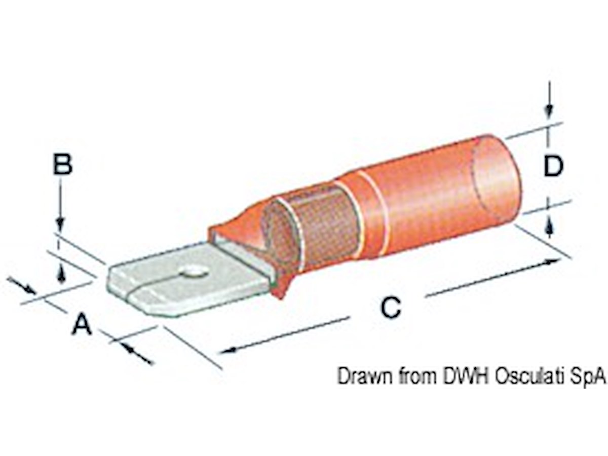 Tipo: Maschio A mm: 6,35 B mm: 0,8 C mm: 28 D mm: 4,9 Cavo mm²: 1,2/2,5 pcs : 100
